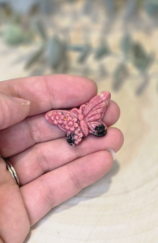 Papillon et fleurs en Rhodonite