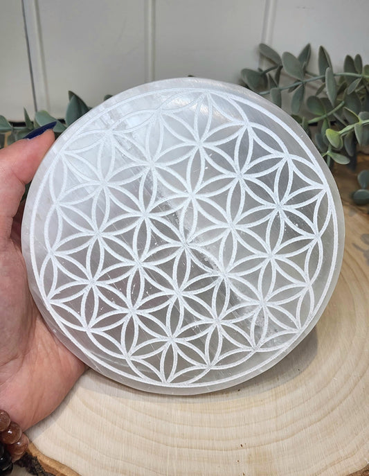 Plaque Sélénite hexagonale Fleur de vie chakras