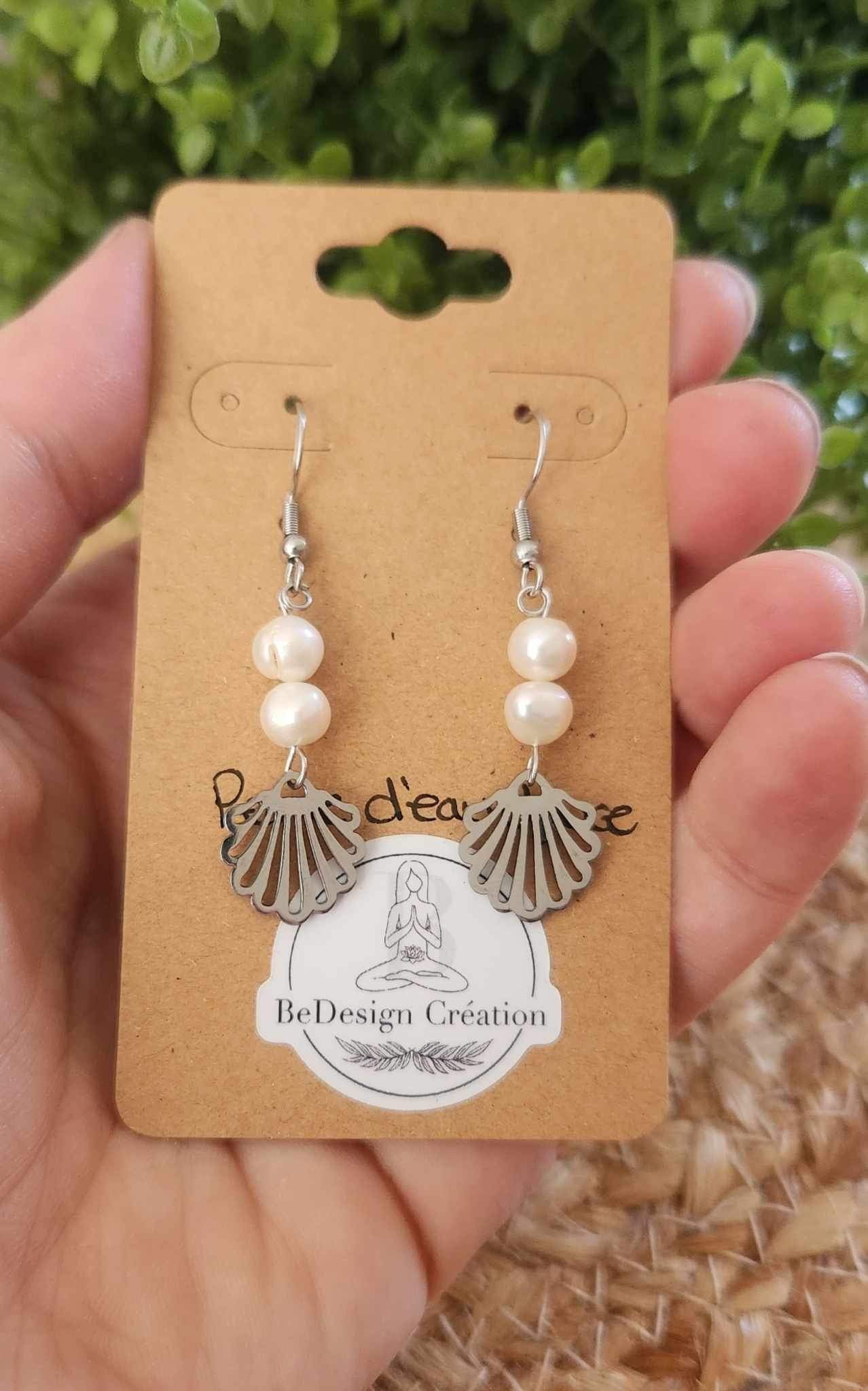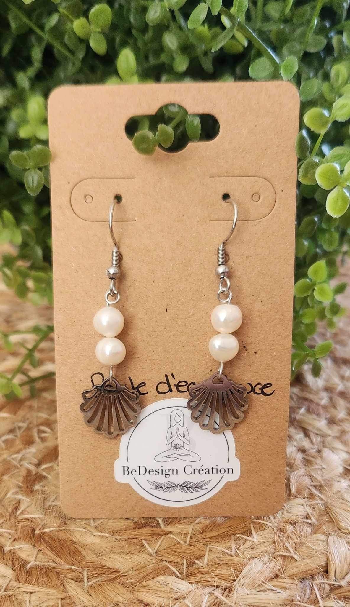 Boucles d’oreilles en acier inoxydable avec d'un coquillage accompagné de Perle d’eau douce.