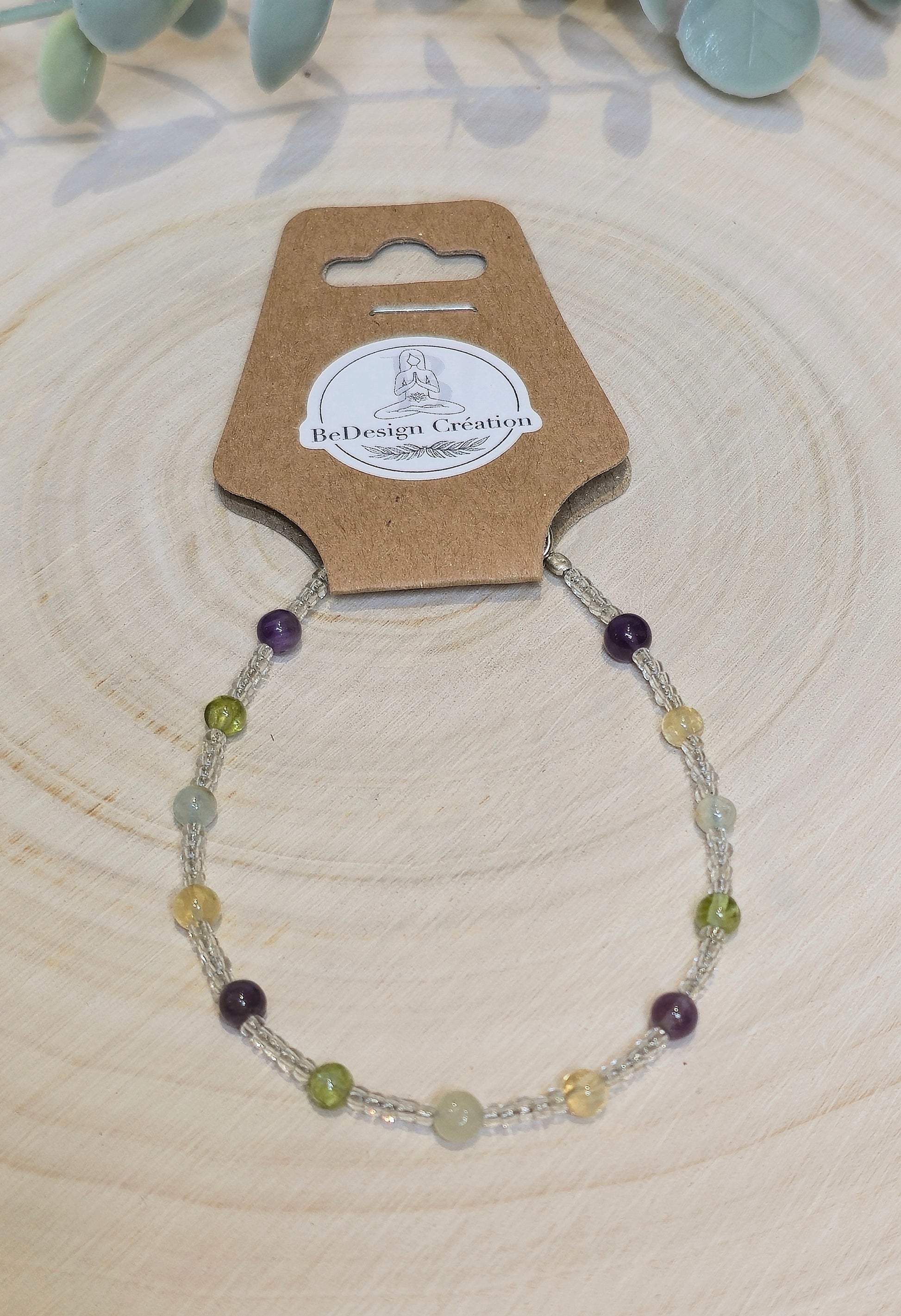 Pierres précieuses : Améthyste, Péridot, Citrine, aigue-marine et perles transparentes.