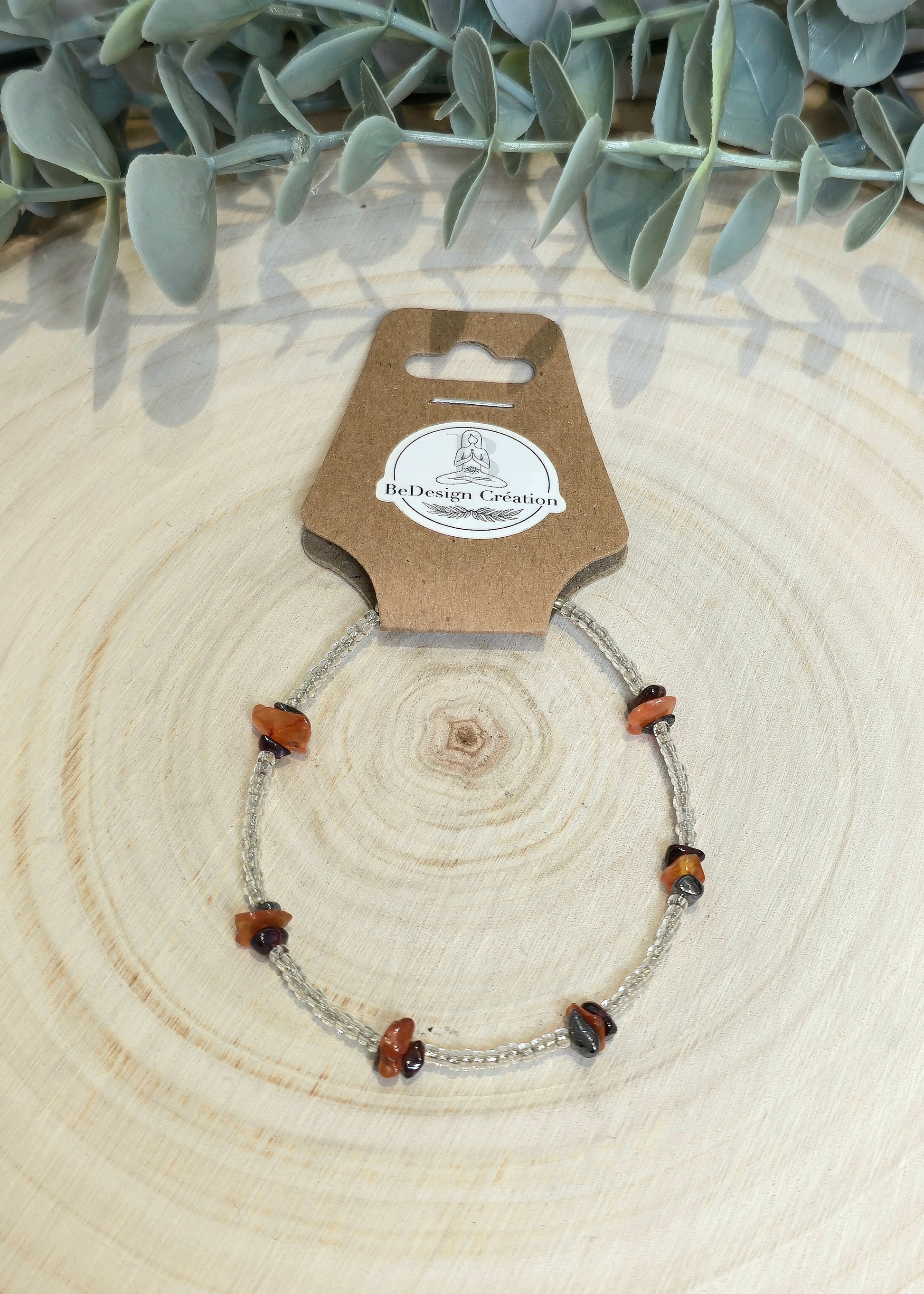 Pierres précieuses : Hématite, Cornaline, Grenat et perles transparentes.