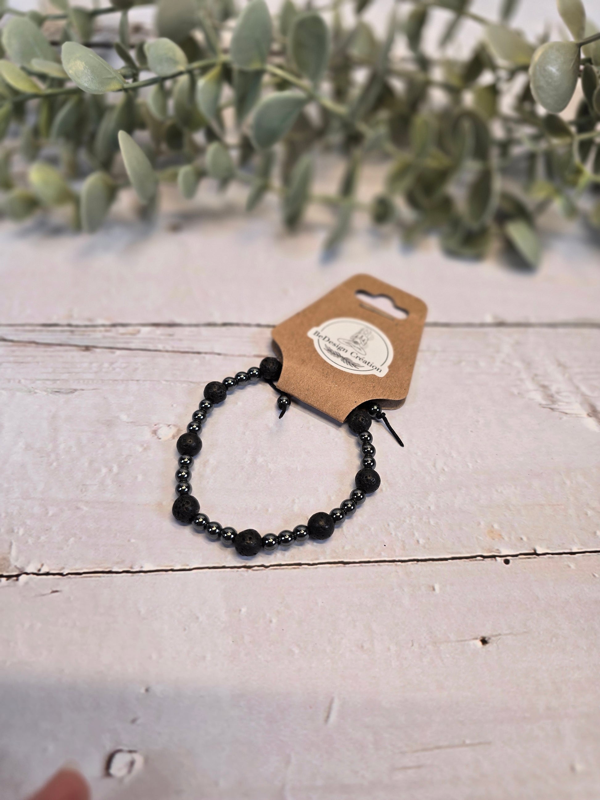 Pierres précieuses : Hématite, Pierre de lave (des huiles essentielles peuvent être mises sur cette pierre)