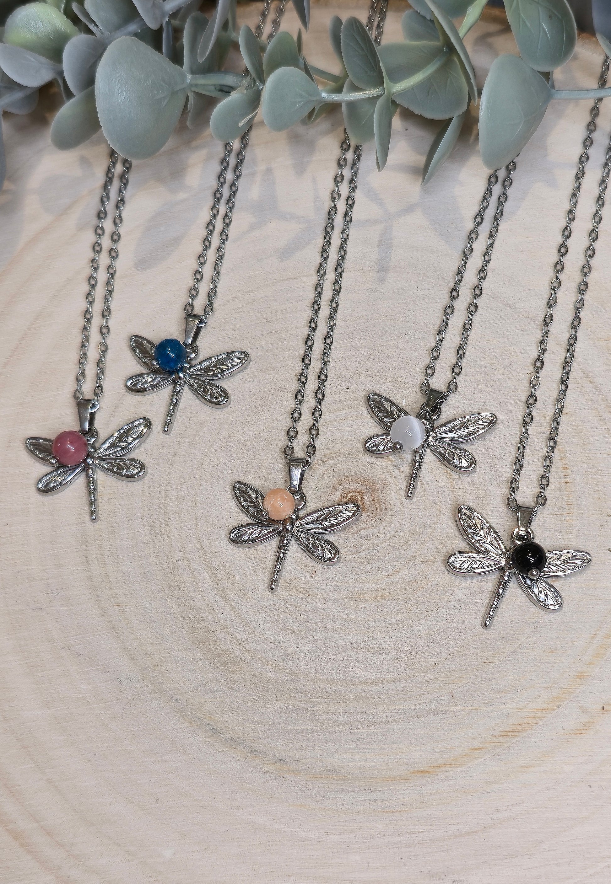Magnifique chaîne avec un Libellule en acier inoxydable avec une pierre.