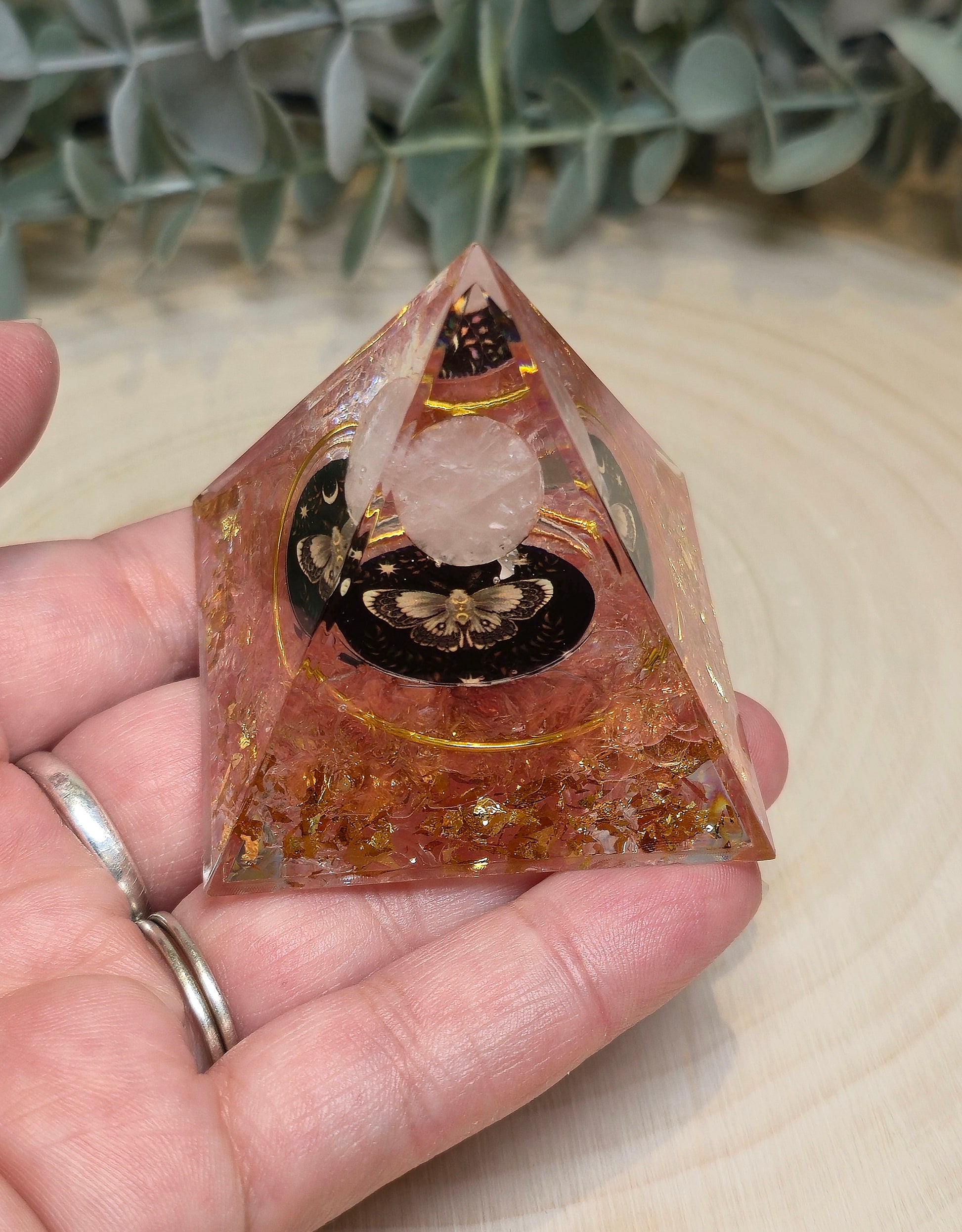 Pyramide Orgonite avec pierres - Quartz rose et papillon