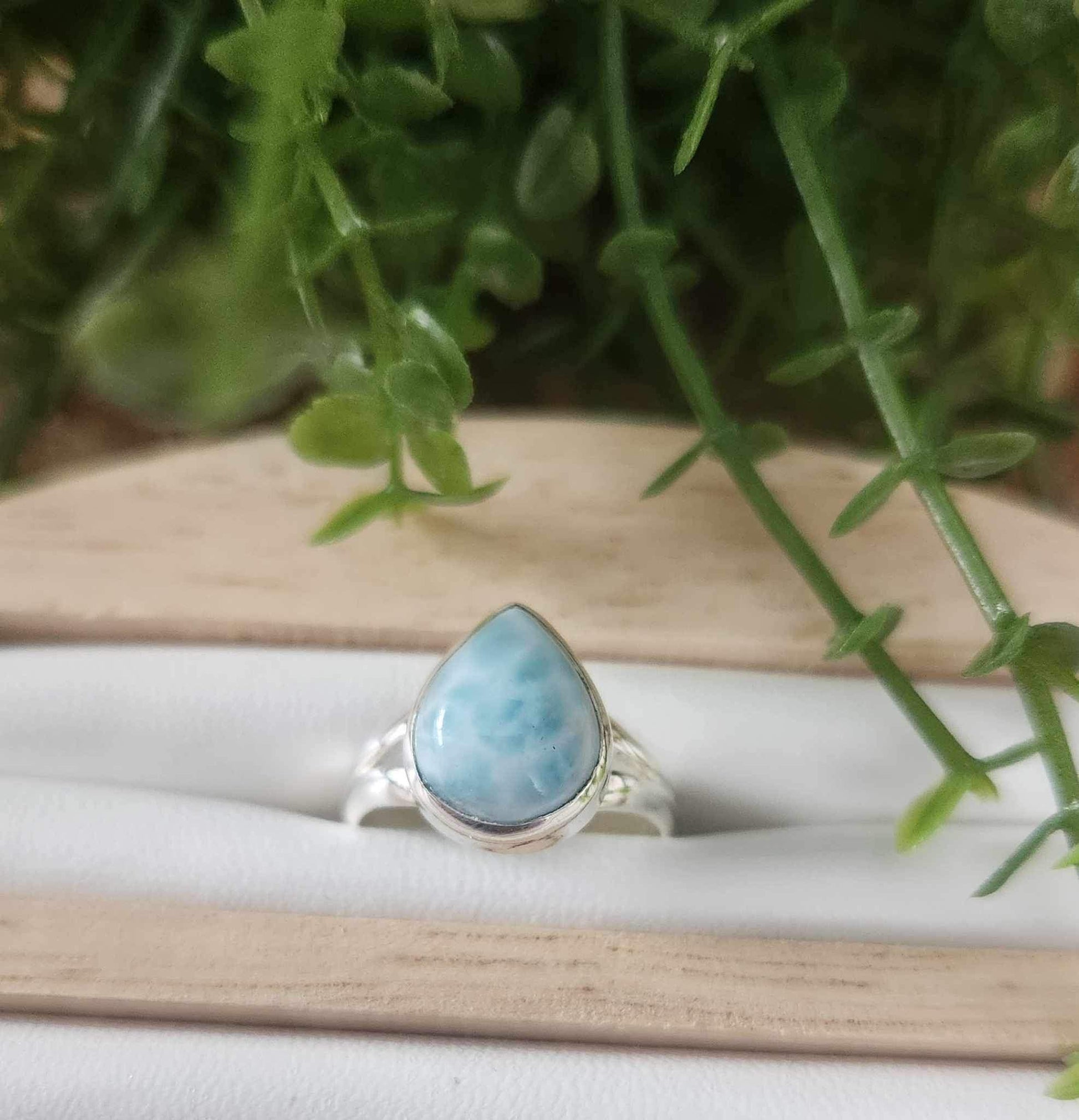 Bague en argent sterling 925 avec une Larimar en forme de goutte d’eau.