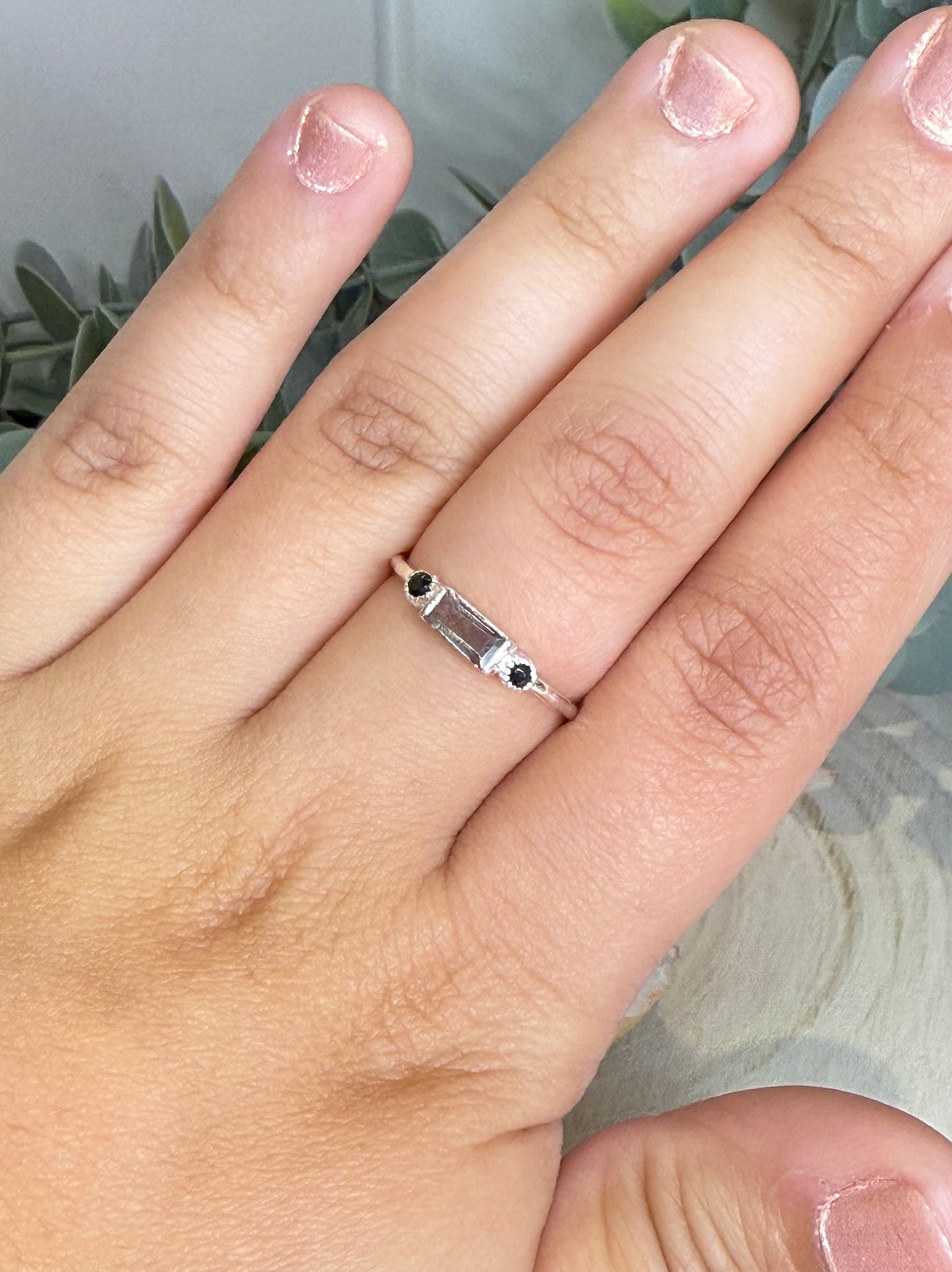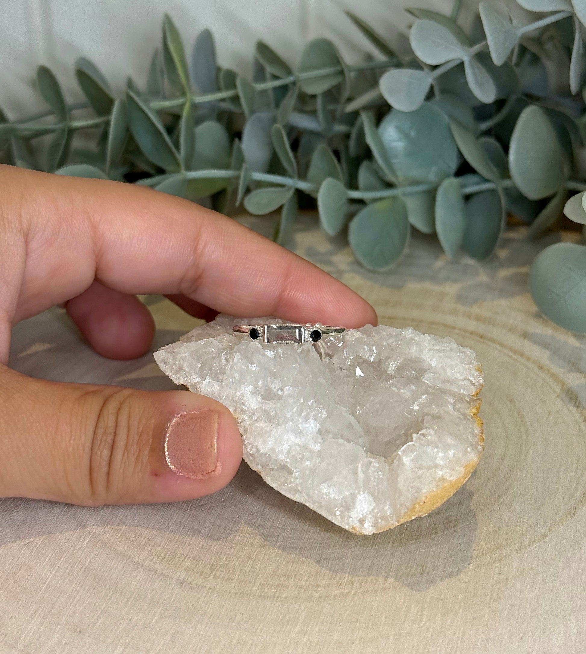 Bague en argent sterling avec une Labradorite rectangle et deux Onyx ronde.