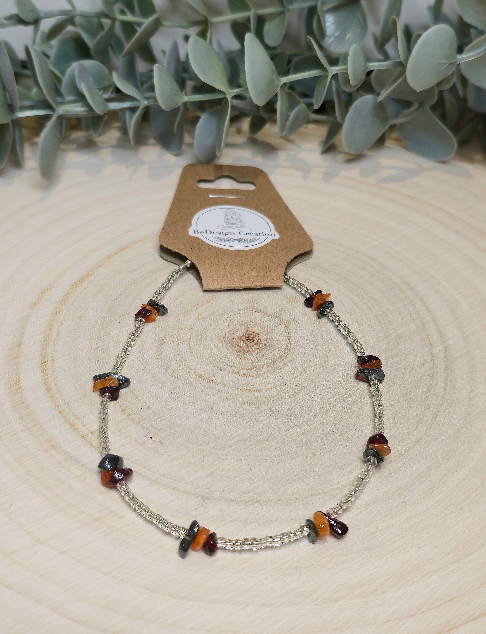 Pierres précieuses : Hématite, Cornaline, Grenat et perles transparentes.