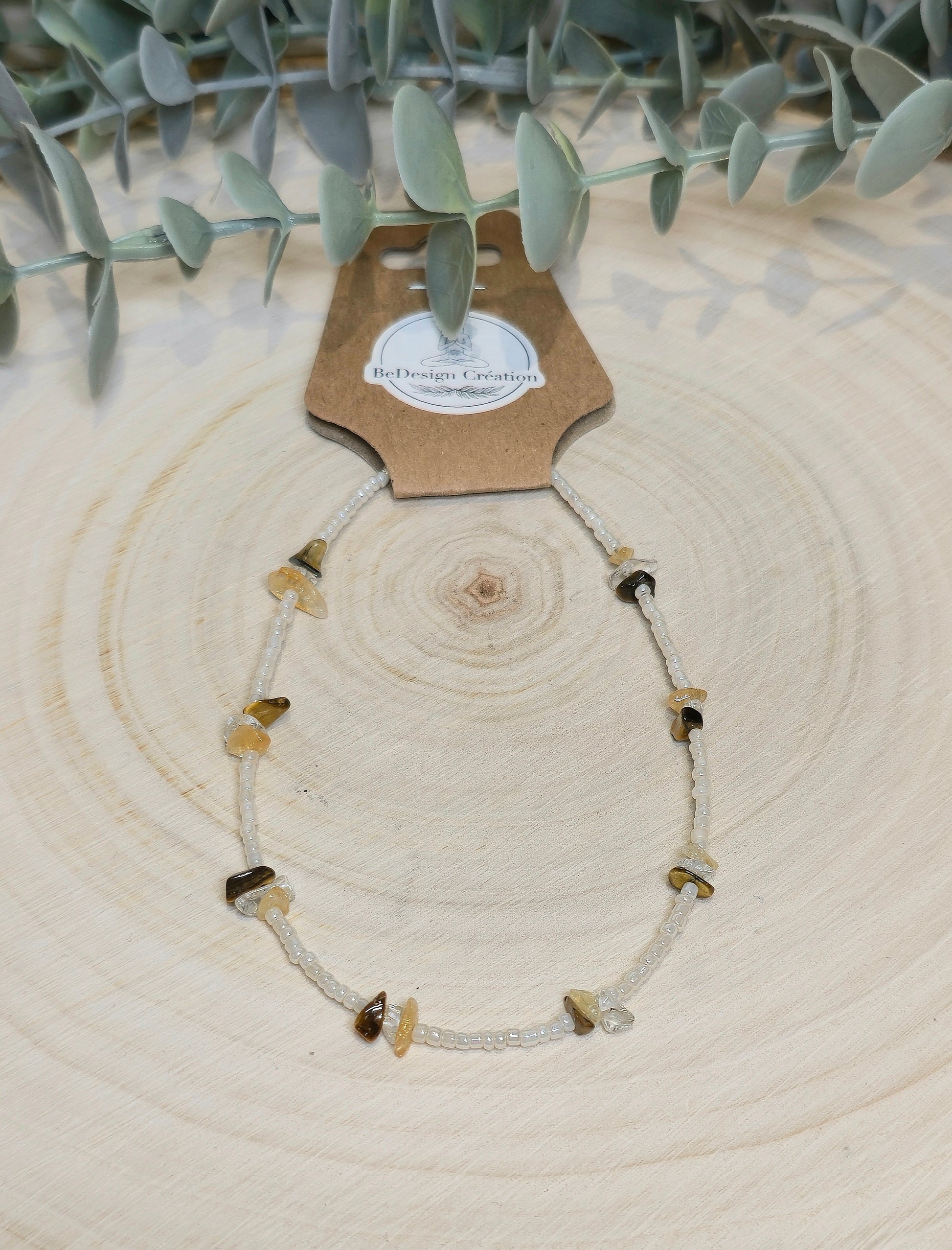 Pierres précieuses : Citrine, Quartz clair, Oeil de tigre et perles transparentes.