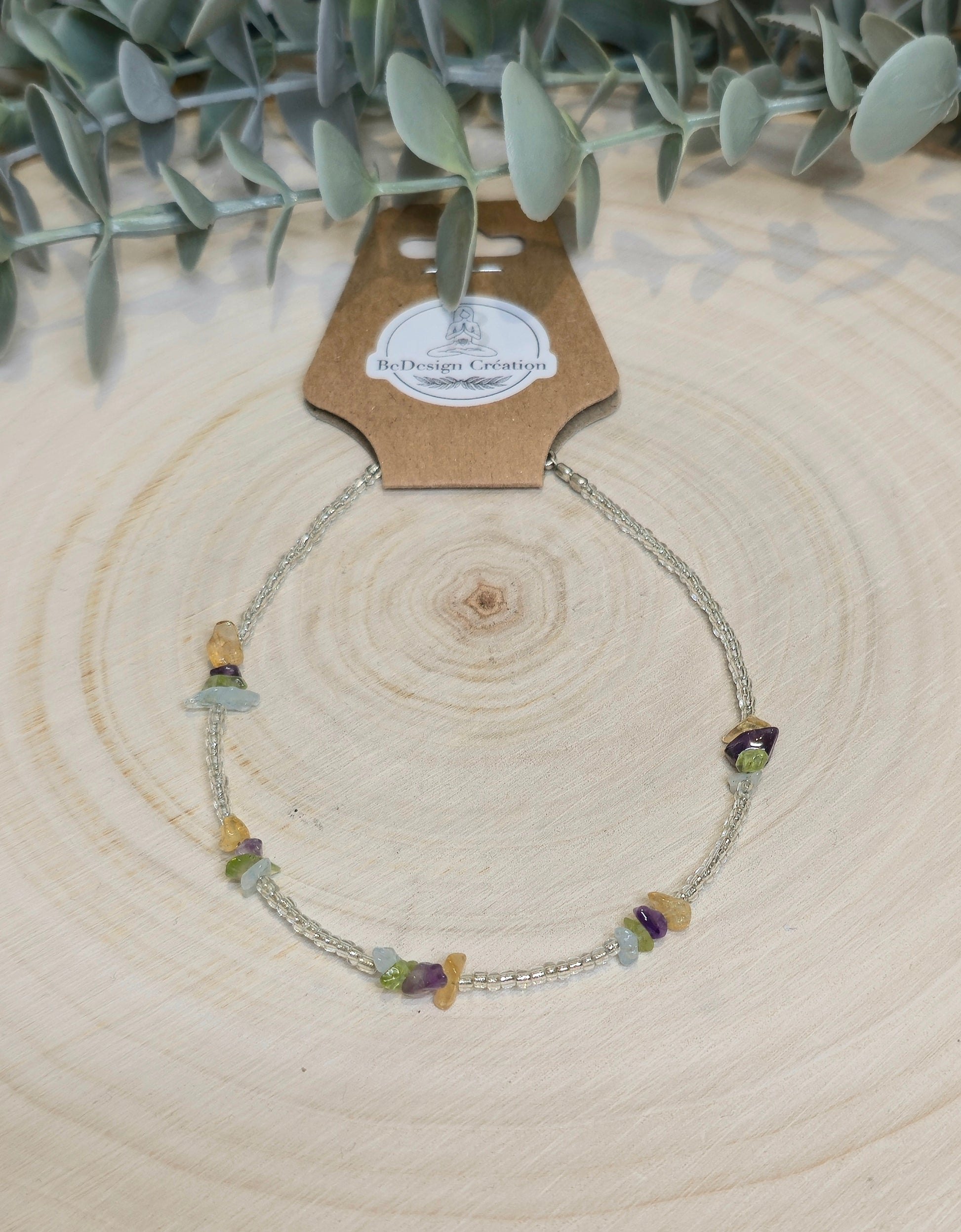 Pierres précieuses : Améthyste, Péridot, Aigue-Marine, Citrine et perles transparentes.