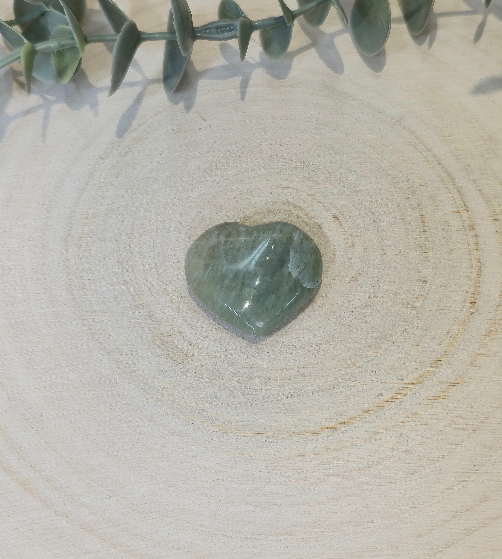 Coeur en Pierre de lune verte à utiliser en méditation, en décoration, à porter sur soi ou selon votre volonté.