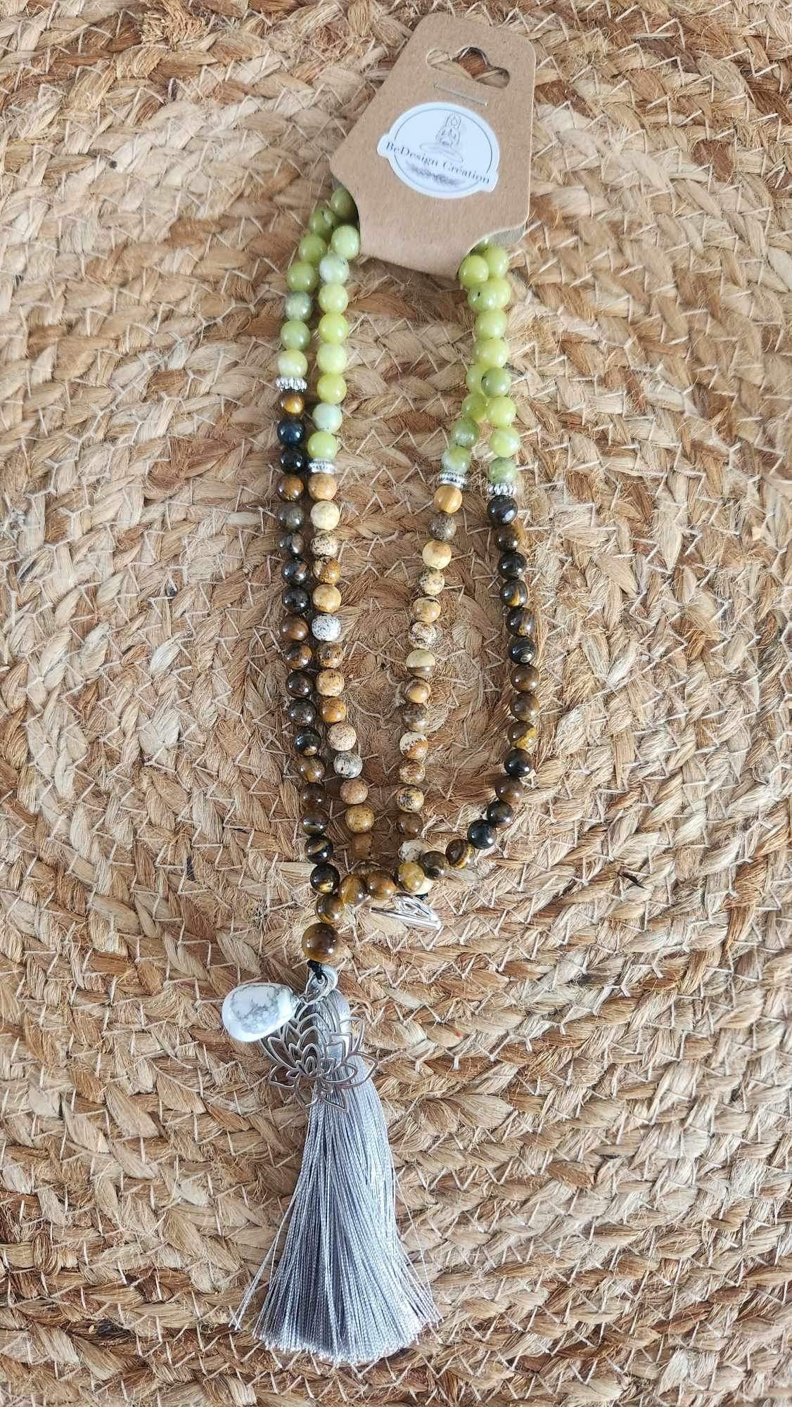 Ce malas contient des pierres d,Œil de tigre, Péridot, Jaspe image et un pendentif de Howlite.