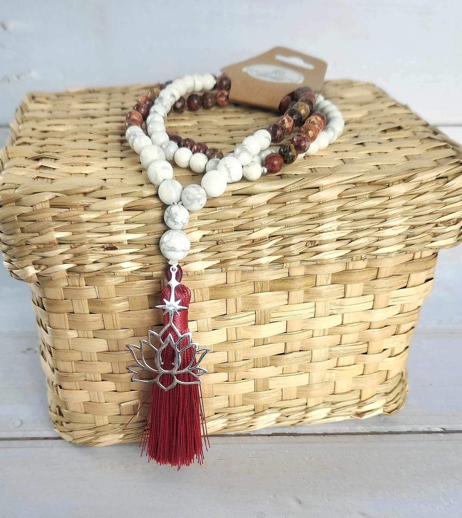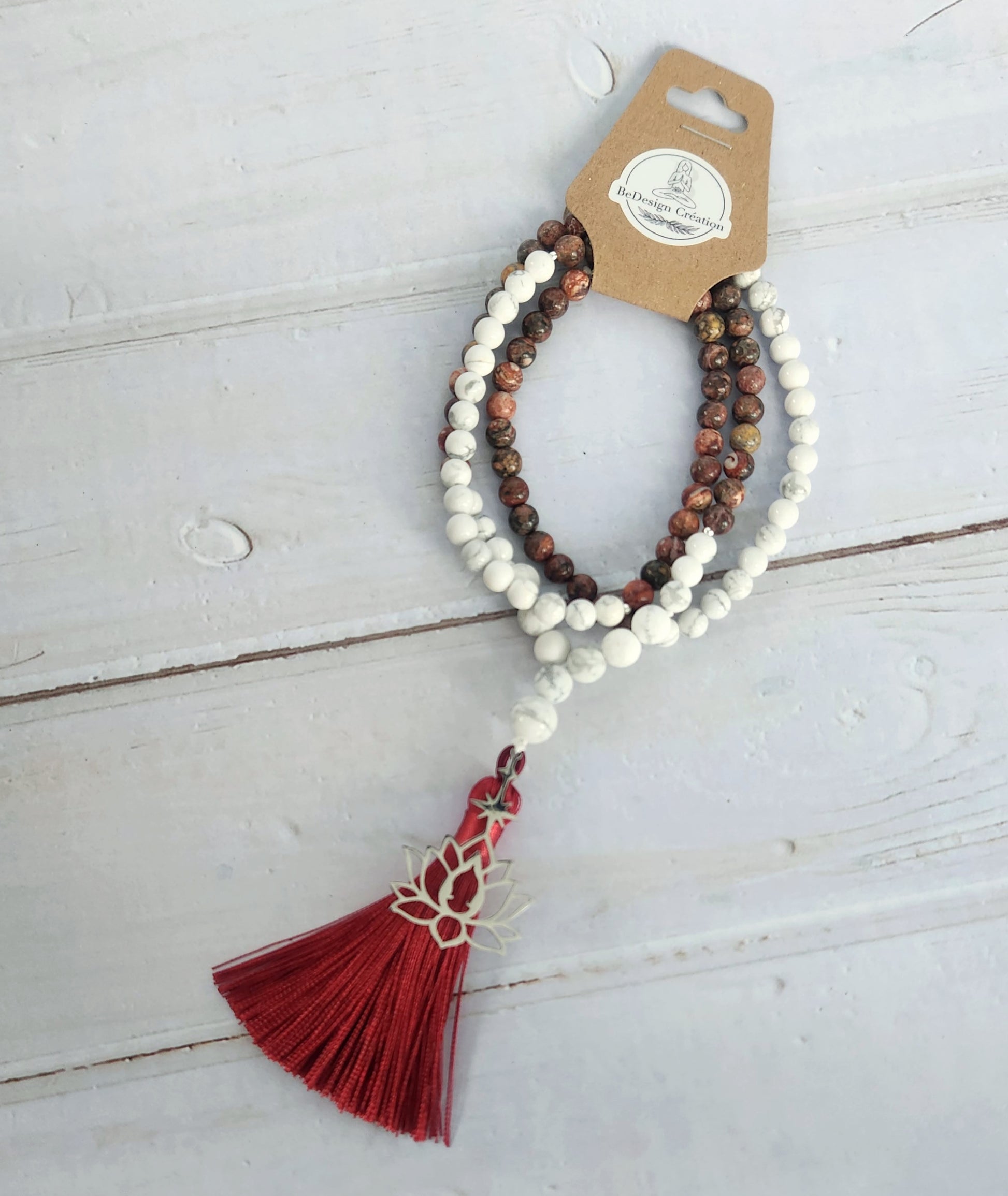 Ce malas contient des pierres de Jaspe léopard ainsi que de Howlite.