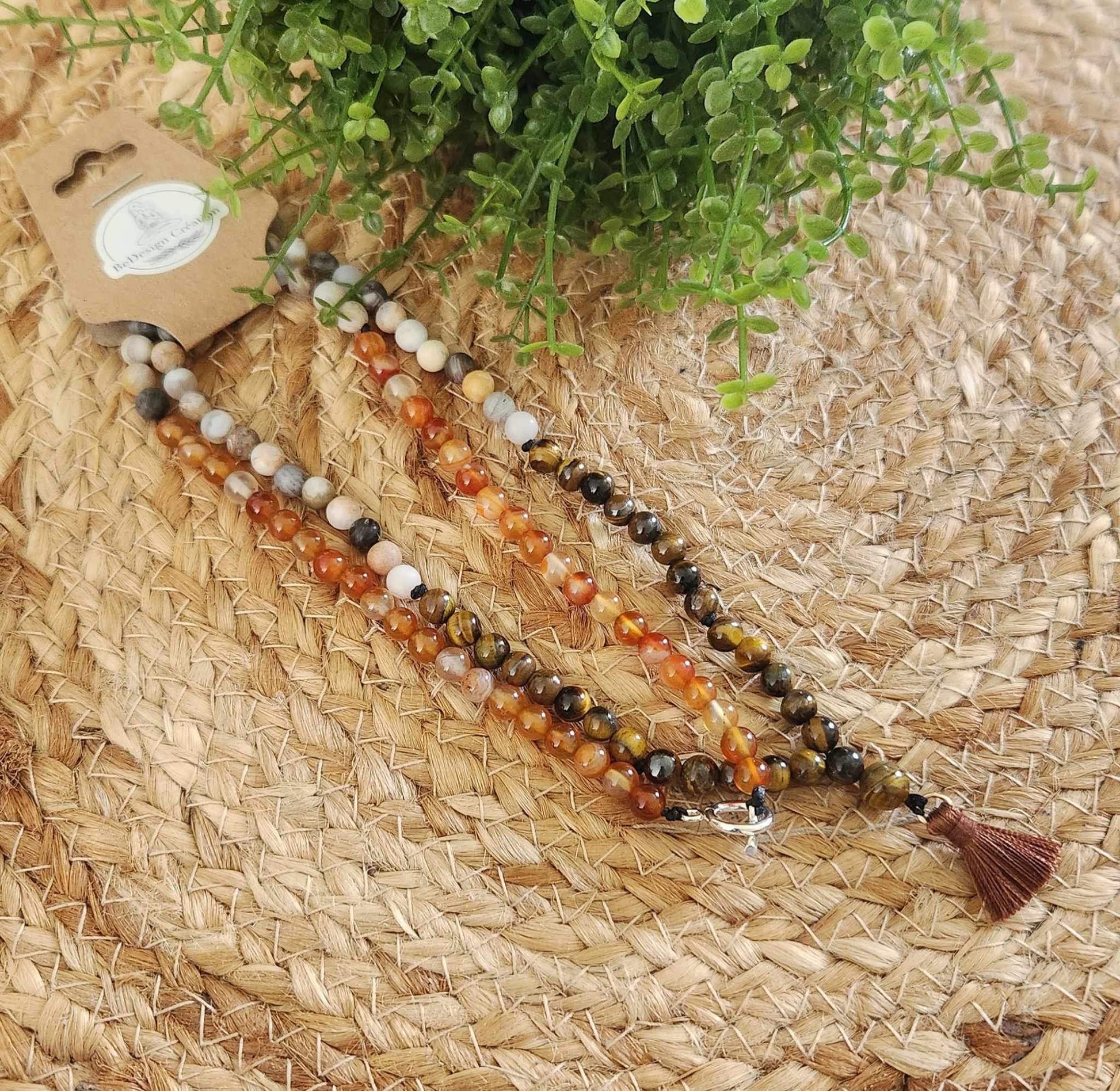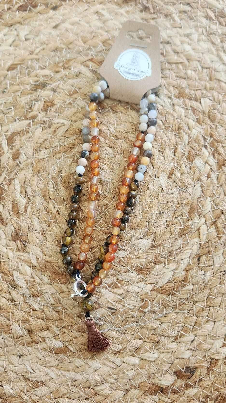 Ce malas contient des pierres de Cornaline, Agate bamboo leaf, Oeil de Tigre.