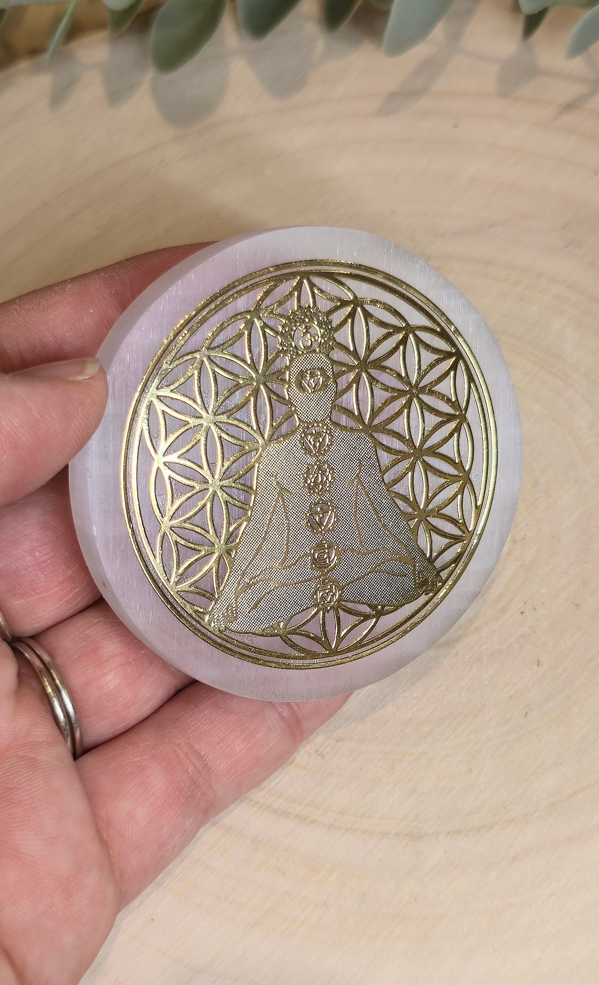 Sélénite Fleur de vie méditation Chakras gold