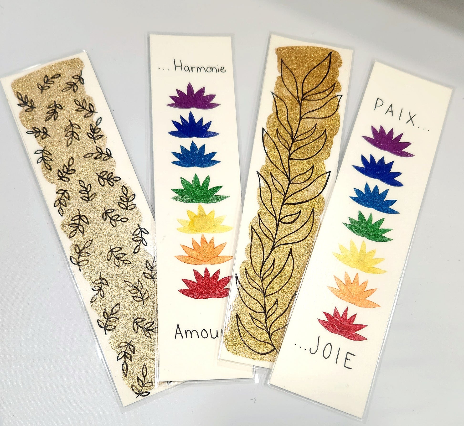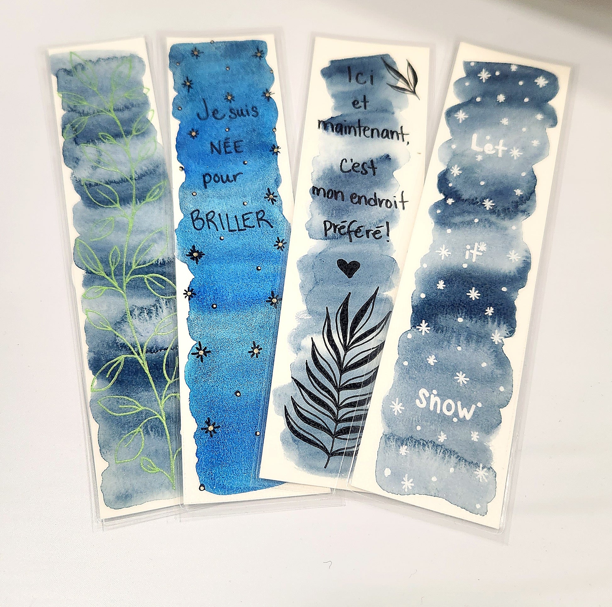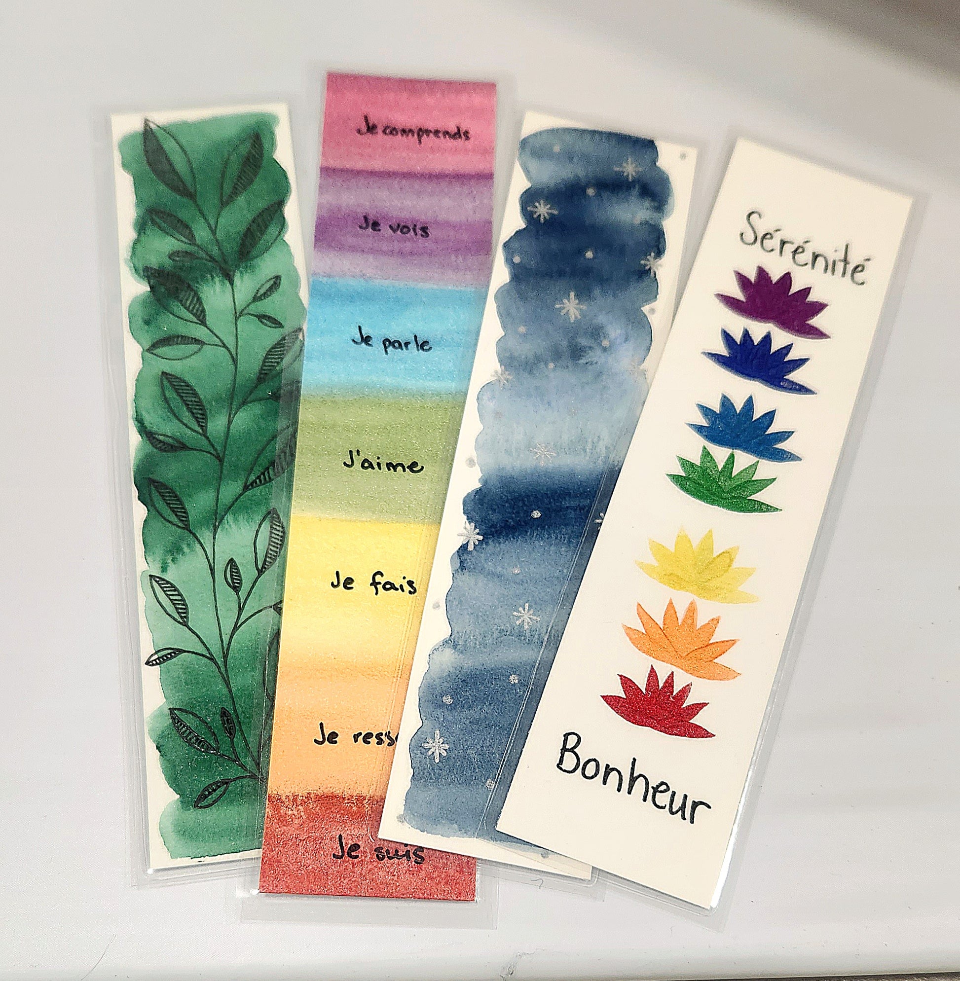 Chaque signet est fait en aquarelle à la main et plastifié afin de vous permettre de l'apporter partout et qu'il reste beau. Un café qui se renverse dessus ? Pas de problème. On essuie et on le remets dans notre livre.